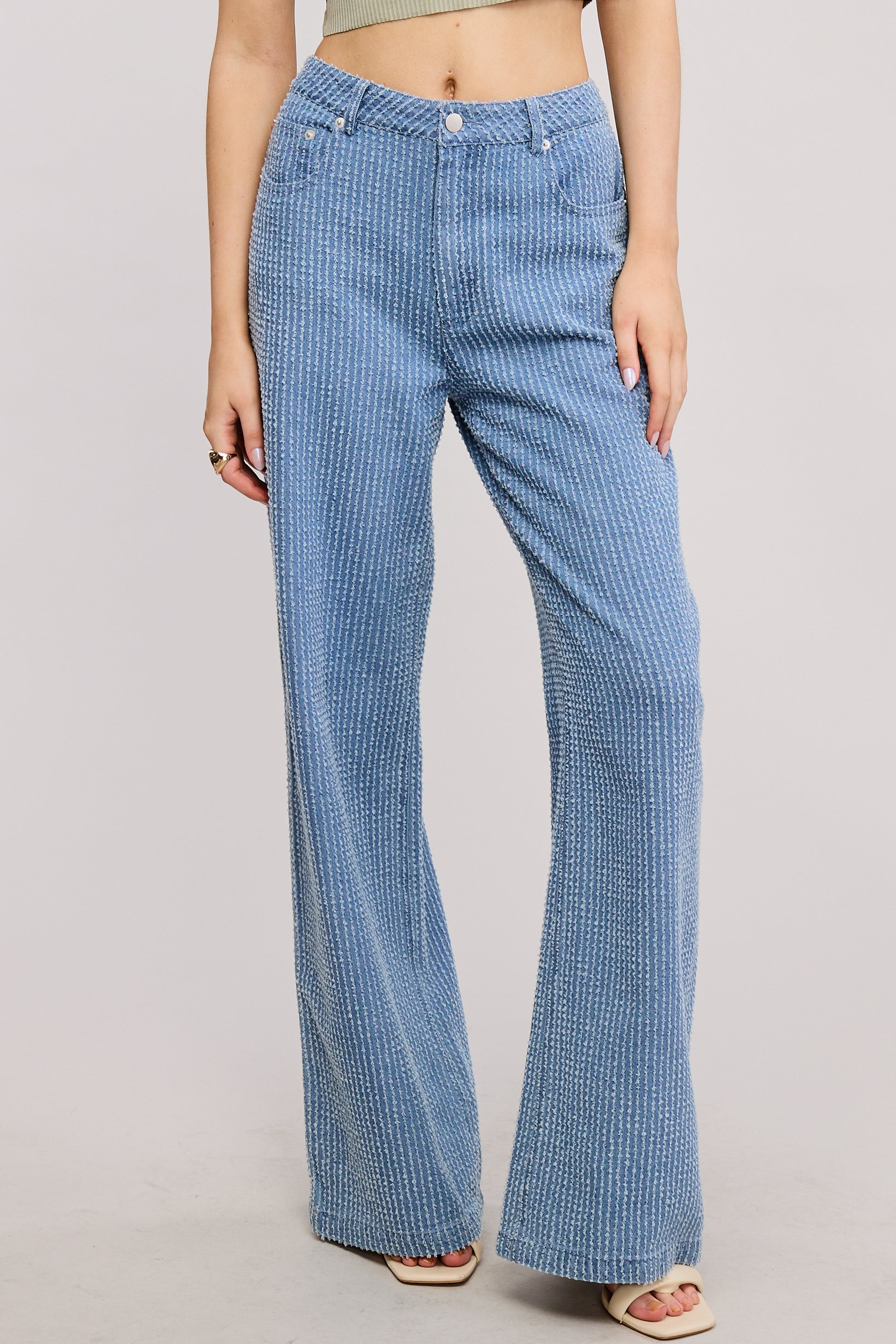 MEDIUM- WASH DENIM JEANS FEATURE DISTRESSED STRIPE DETAILING MID TO HIGH WAITED WAISTBAND.