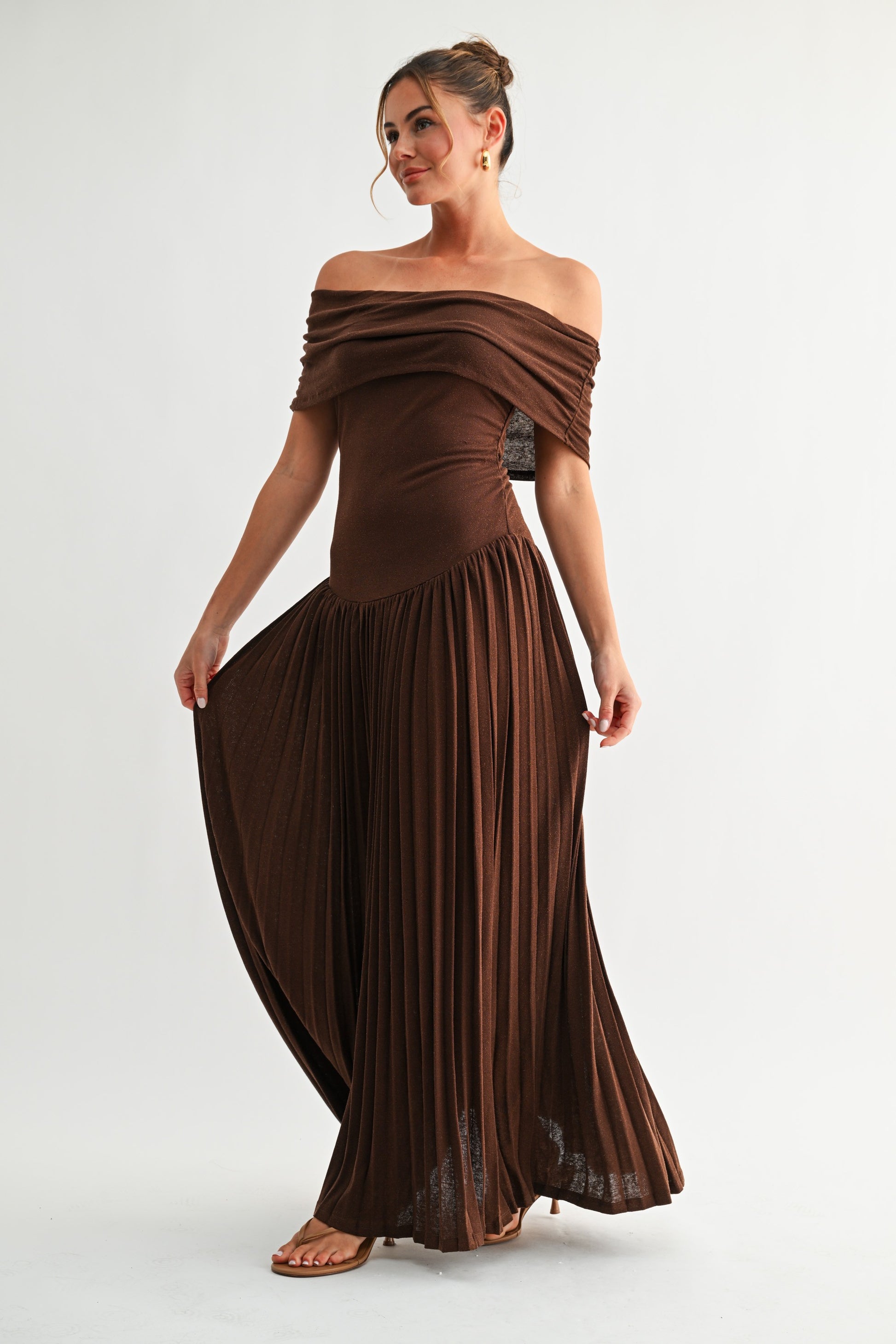 The ruched bodice gently drapes over the shoulders, while the pleated maxi skirt adds graceful movement with every step. Subtle sparkles throughout the fabric give this piece a sunlit shimmer, making it perfect for daytime events or golden hour outings.