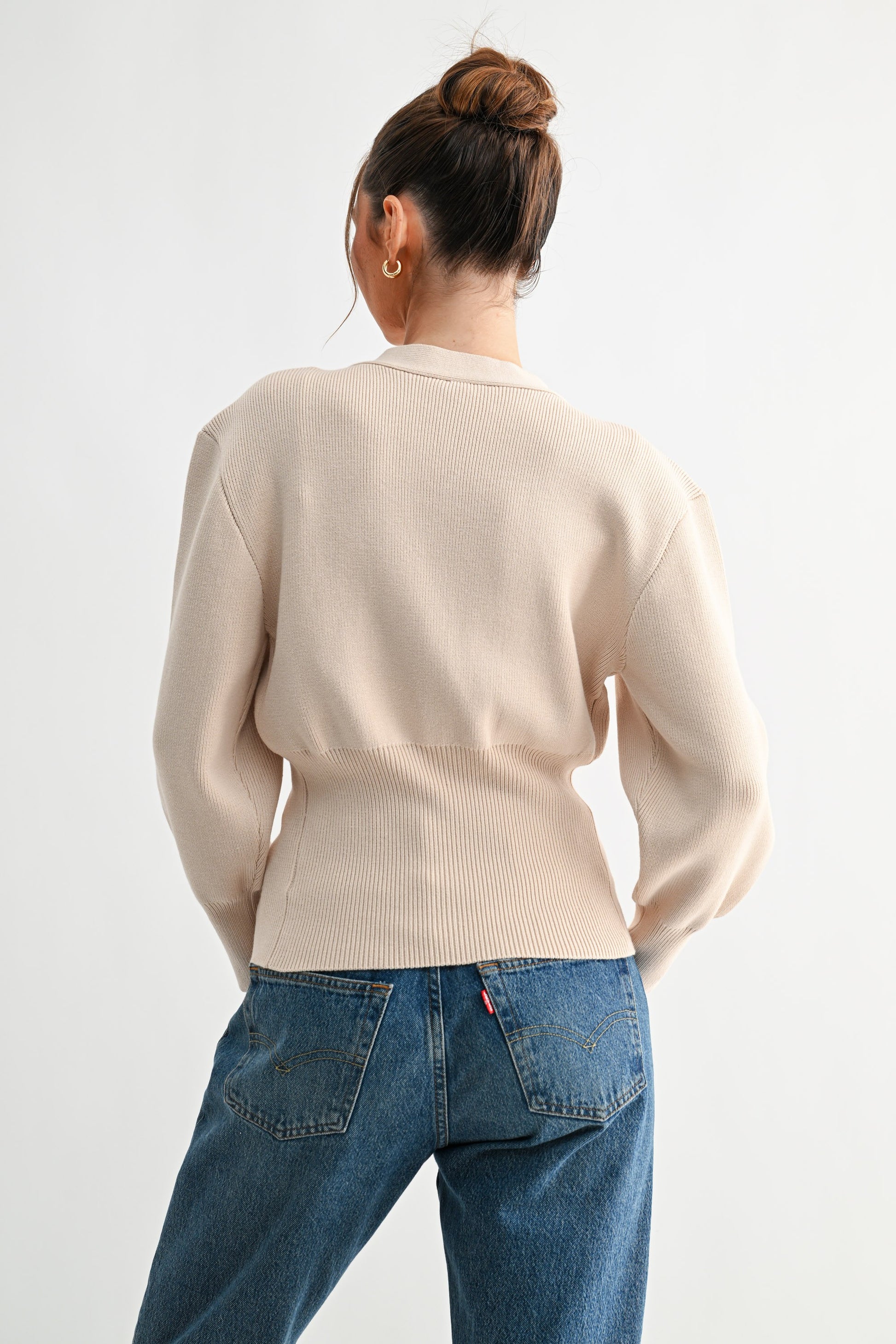 A refined take on casual layering, this cardigan features a deep V-neckline and voluminous sleeves for a soft yet structured silhouette. The front is accented with a bold, sculptural gold-tone button that serves as a decorative focal point, while the cardigan remains open for effortless styling. Ribbed detailing along the hem, cuffs, and neckline enhances its tailored fit while maintaining comfort.