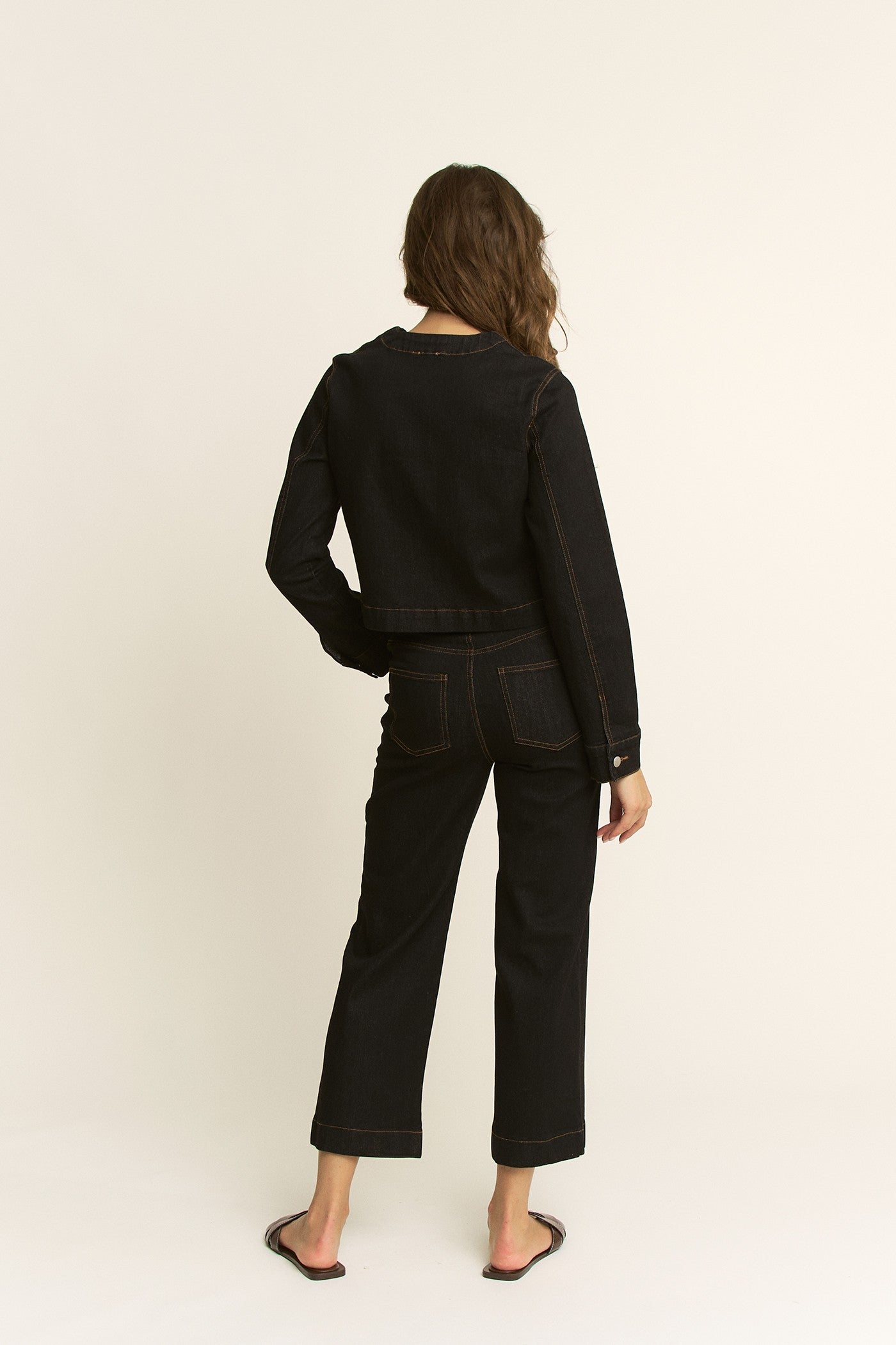 -BLACK DENIM TOP& BOTTOM SET -ROUNDED EDGE DENIM JACKET -MIDI LENGTH BLACK DENIM JEANS -4 BUTTON CLOSURE ON TOP & BOTTOM -NO BACK DETAILS ON JACKET -5 POCKET JEANS -STRETCH DENIM FABRIC